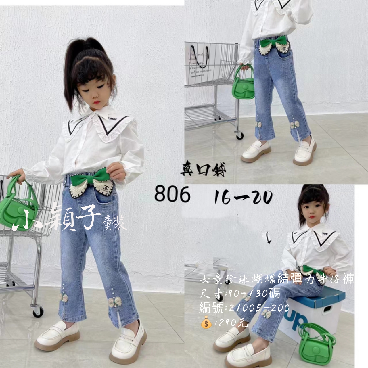 【台灣現貨】中小童 女童珍珠蝴蝶結彈力牛仔褲 數量