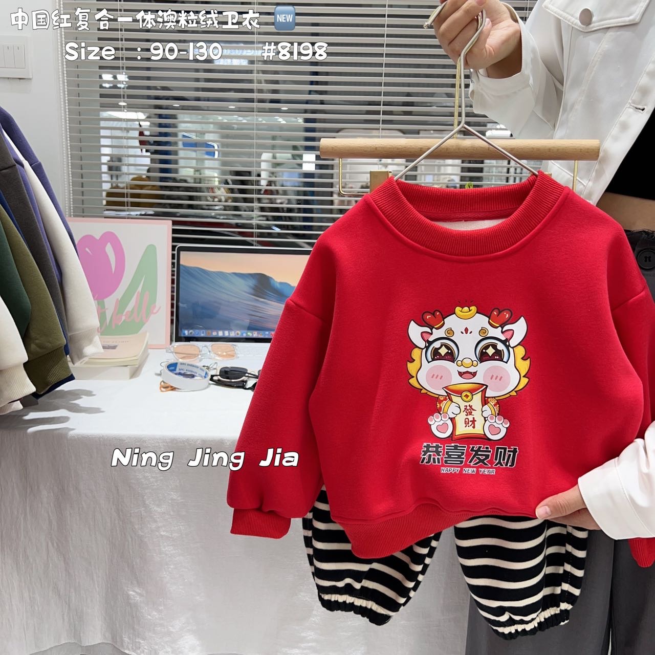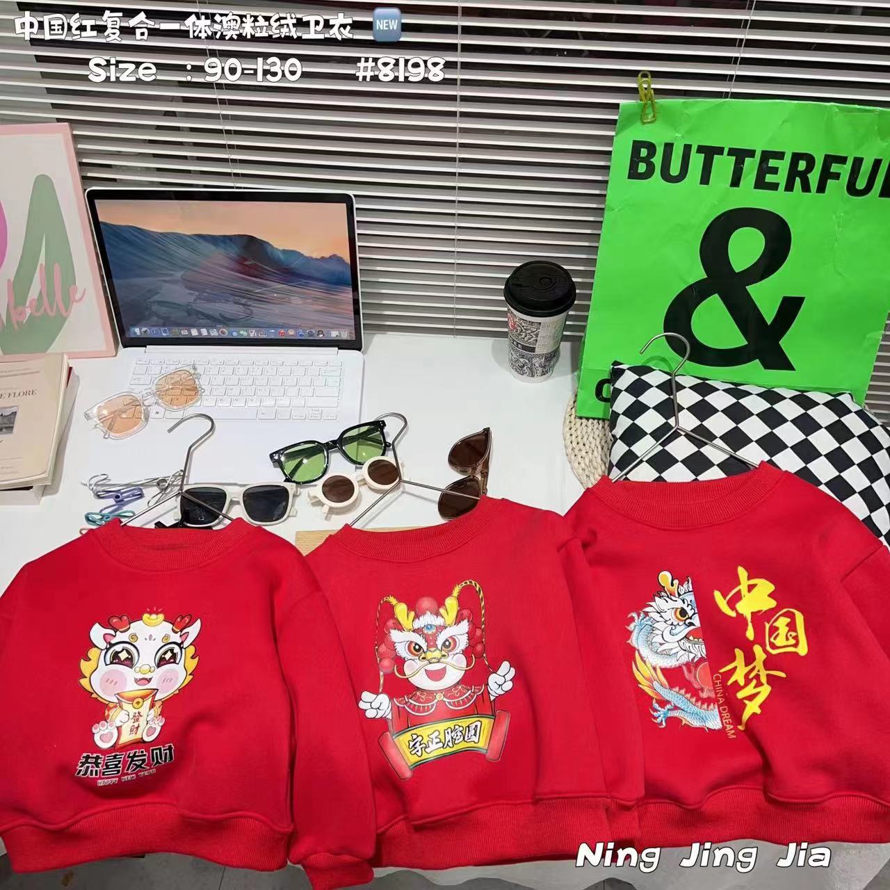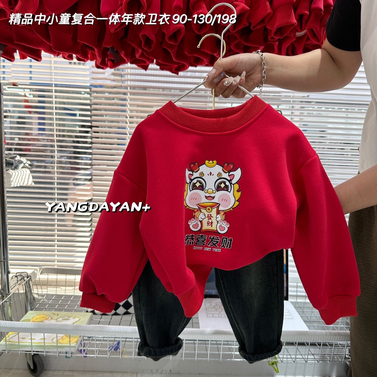 🔥【台灣現貨】🔥 2024年 龍年 恭喜發財 中小童 男女童 中國紅復合一體奧粒絨年服 衛衣 800015-115 顏色:紅色 尺寸:90-130碼